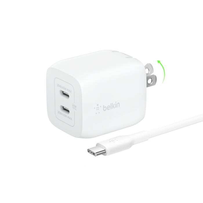 Belkin BoostCharge Pro Dual USB-C GaN Wall Charger 45W White WCH011myWH delivers fast, efficient charging for two devices simultaneously using GaN technology. This compact dual-port charger supports up to 45W total output with Power Delivery 3.0 and PPS. Users in Nairobi and Kenya charge MacBook Air, iPhone 15 series, iPad Pro/Air, Samsung phones, and other USB-C devices quickly and safely. The foldable plug design makes it travel-friendly. The clean white finish matches modern setups perfectly.