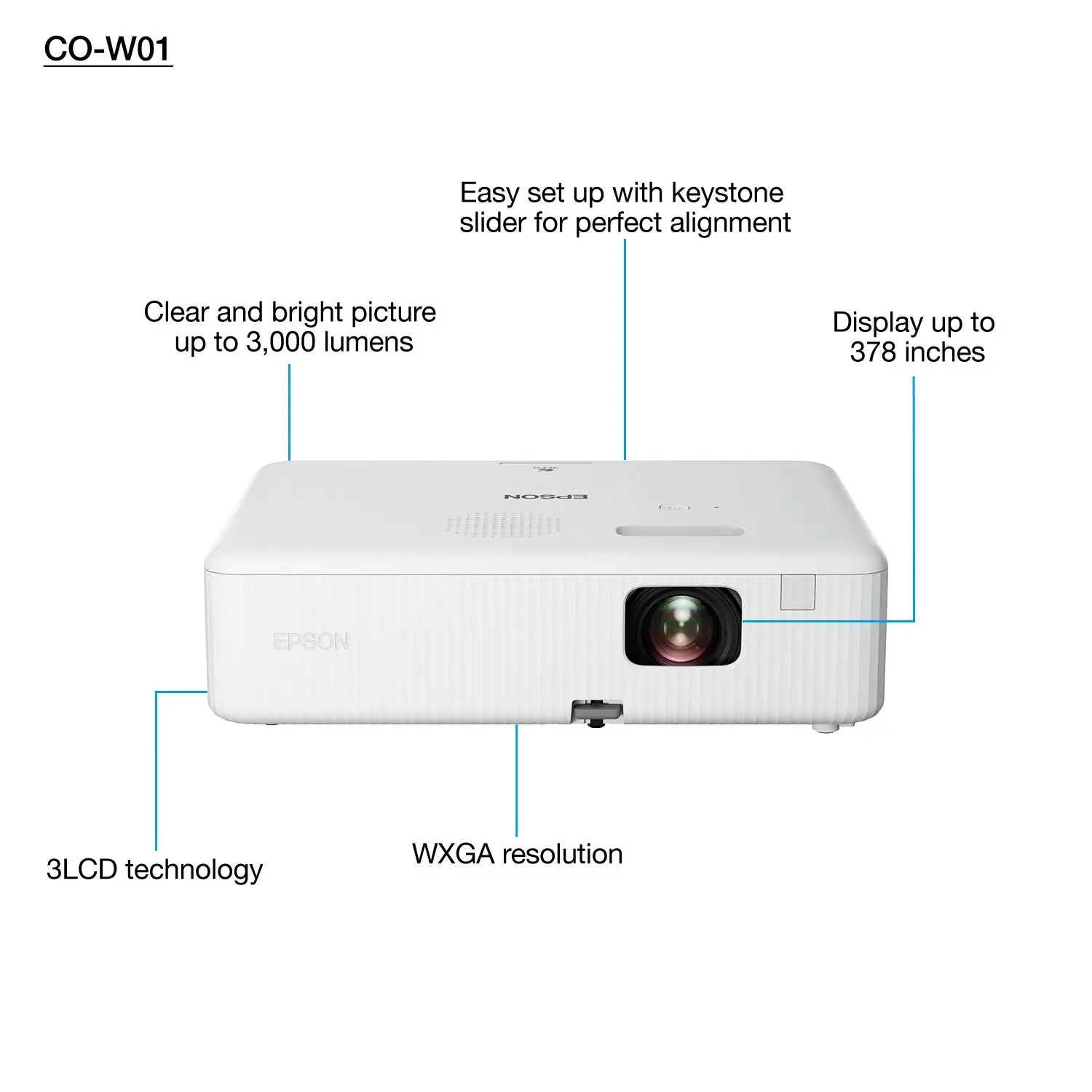 Epson CO-W01 3LCD Projector – WXGA, 3000 Lumens, Portable & Reliable (V11HA86040)