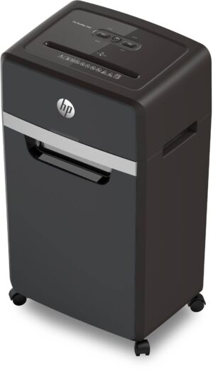 The shredder integrates effortlessly into office setups, complementing HP products like printers or scanners from HP’s official site. Its low power consumption (0.5 watts in sleep mode) and compact design (424 mm x 295 mm x 645 mm) suit energy-efficient and space-conscious environments.