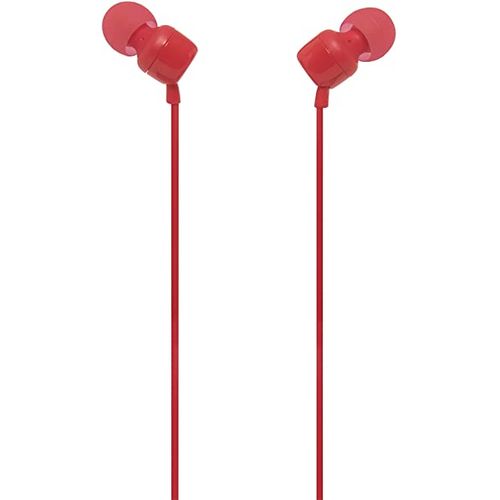 The JBL Tune 110 Red Earphones deliver signature JBL Pure Bass sound in a lightweight wired design. These in-ear headphones feature a tangle-free flat cable and built-in microphone. They offer convenient one-button remote control. Enjoy reliable audio in a bold red color.