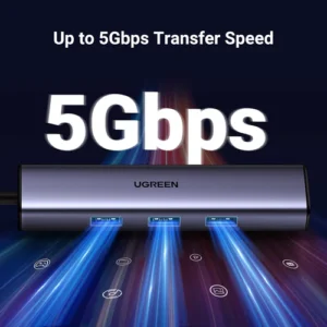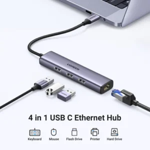 The UGREEN USB-C 3-Port Ethernet Hub CM475 is a versatile, high-performance adapter that expands your USB-C device’s connectivity with three USB 3.0 ports and a Gigabit Ethernet port. Ideal for professionals, gamers, and remote workers, this hub delivers 5Gbps data transfer speeds and a stable 1000Mbps wired network connection. Its sleek aluminum design ensures durability, making it a perfect companion for modern laptops and tablets.